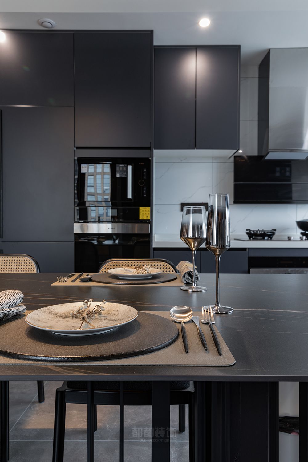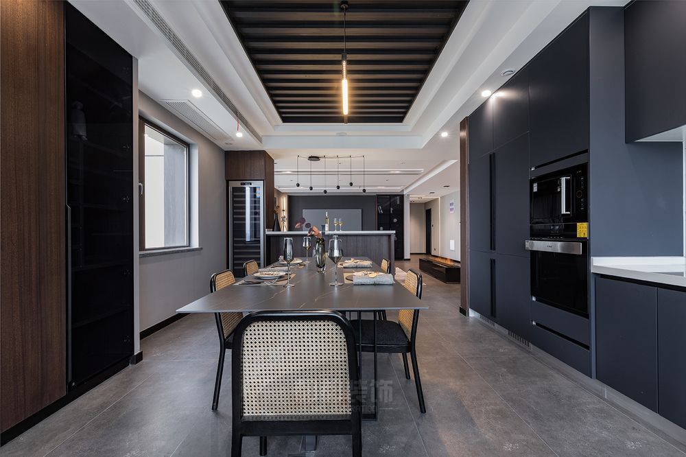 ▲ 厨房与餐厅均为开放式,亚光黑的饰面在视觉上延伸着空间,为这一处空间营造一道沉稳而坚定的背景,它不跳跃,而又塑造着空间的层次,模糊了空间的界限,仿佛映照着一个更为深层的空间领域。 ▲ 长木桌构建起动态的生活空间,可用于餐食、工作与学习,拥有一方宽广的休闲空间。