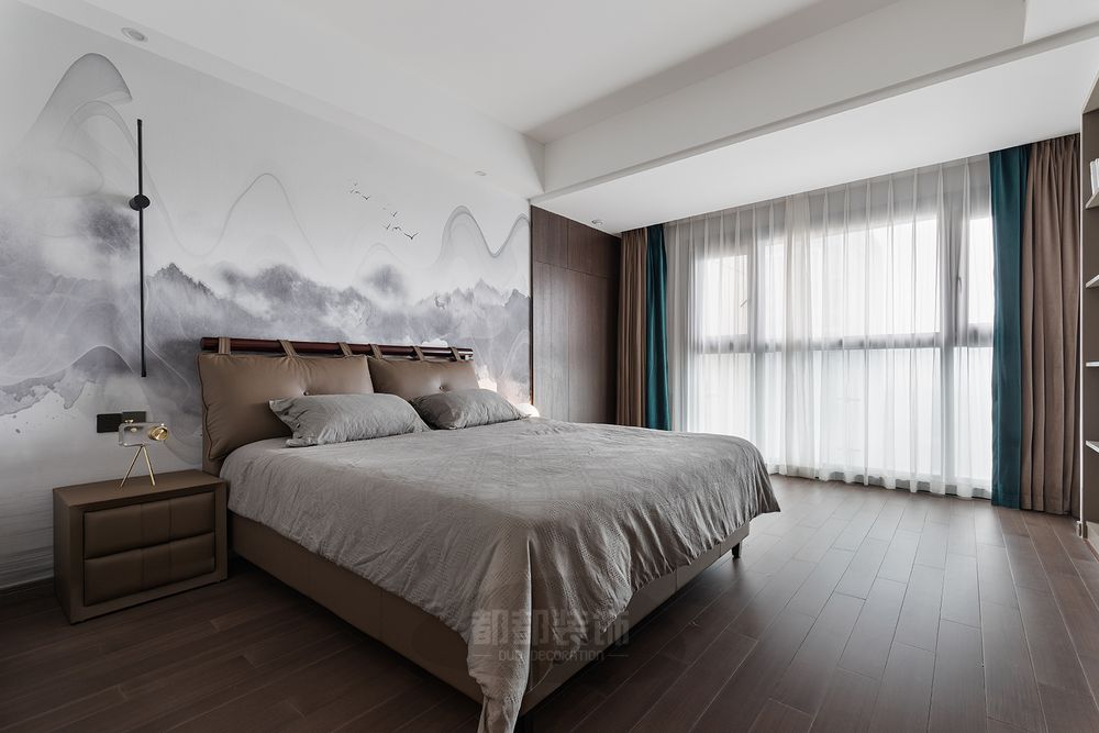 ▲ 卧室延续中性、克制的色调,空间的柔软之处体现于家具、床品的品质,也构建于身体的舒适与放松。悬空式的床体加上灯光设计,现代感十足。 氤氲的画面,配合灯光,隐约的情绪渗透于空间,使空间氛围感更强。 ▲ 次卧简雅舒适,大面积落地窗提升空间明亮度,灰色烤漆储物柜,阵列排布,满足置物的同时彰显韵律美。