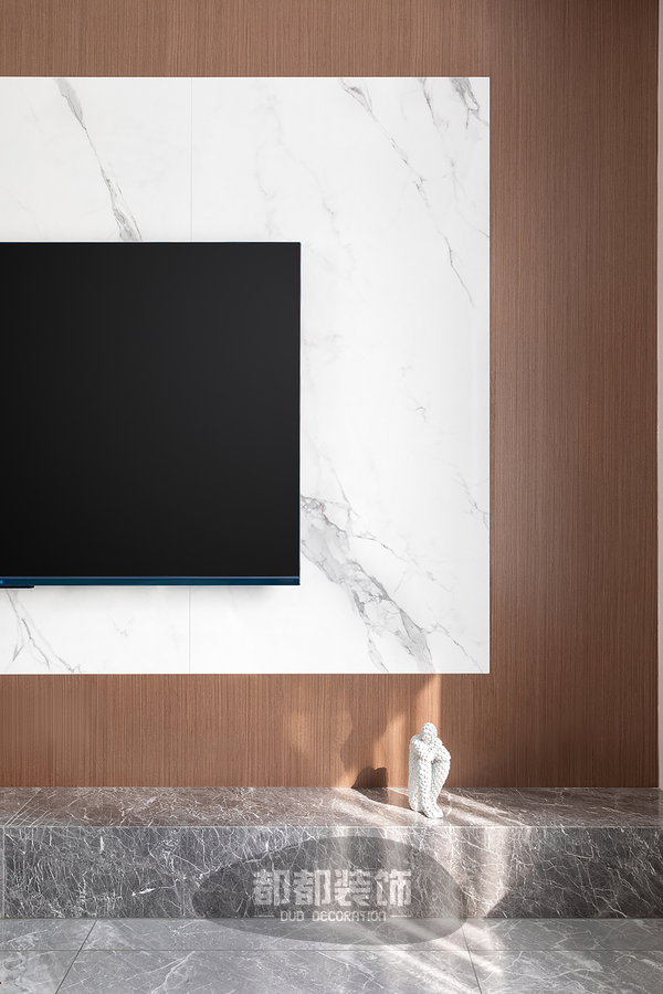 入户,整体呈开放式,通透开阔,墙面是带有肌理感的木色,质朴有温度,为空间营造出一种惬意宁静的气氛,细节处点缀湖蓝、木褐色,恰到好处的丰富了空间层次感。 阳台透过落地窗融入客厅,保证了屋内充足的采光,整个空间内的软装设计偏简约大气,浅灰色的皮质沙发优雅禅意,小巧的岩板茶几,不经意布置的绿植,随意翻开的杂志,几缕跳跃的阳光,充斥着主人对生活无比的赤城,温馨舒适。 飘窗稍微布置下便是一个舒适的休息小空间,木质装饰墙温润自然,绿植一捧送来清新的气息,选个温暖的好天气,窝在这里看本好书,不失是一件身心愉悦的美事。 电视墙黑白色搭配凌厉不啰嗦,木饰面清新雅致,整面造型更显年轻有格调,同材质绅士灰大理石台面,可以摆放一些艺术摆件,增添了空间的趣味性和层次感。