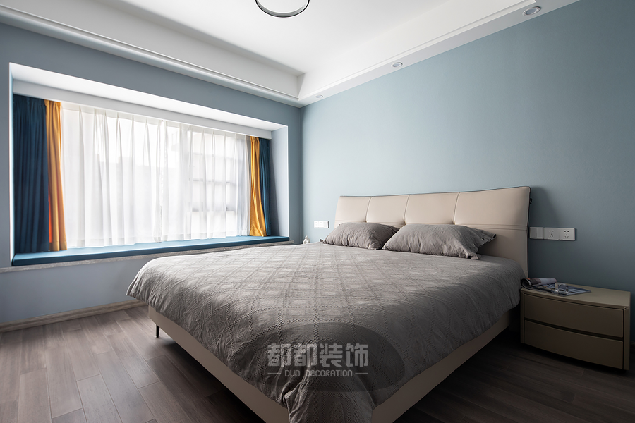 静谧蓝通涂墙面,给人以大海般的平静浪漫,配上自然的原木地板,空间内瞬间有了温度,同样软装的选择上也去繁留简,没有过多的造型和拖沓的软装,太阳光穿透窗帘且洒落一室,带来明净、宽敞的空间感。 与床头同类型的皮质床头柜上时尚简约,干净利落又不失家的温馨感,柜面上摆放着昨晚睡前随手翻阅的书籍,角角落落都是生活的气息。