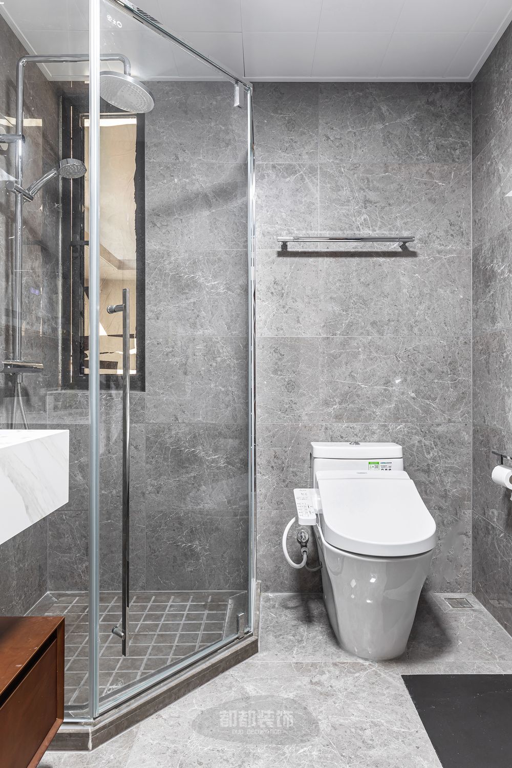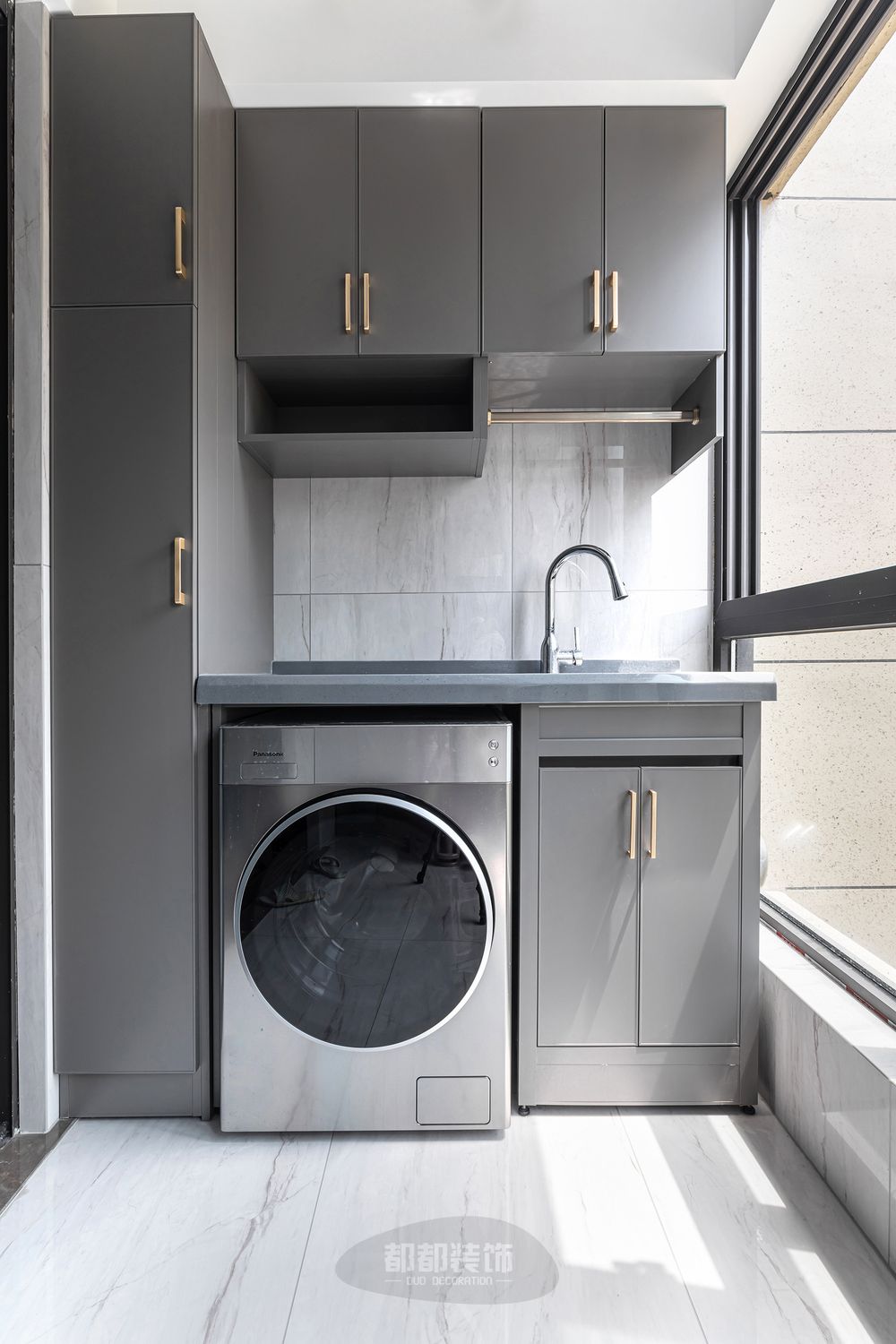 ▲ 卫生间做了干湿分离,大理石瓷砖现代利落,分区利用了玻璃隔断,简洁直观,视觉清爽,洗脸台做了双层悬空处理,下方的实木储物柜满足卫生间的储物功能。 ▲ 阳台设计洗衣机烘干机区,考虑到搓洗方便,把洗烘设计在两边,同时增加拖把区,使整个空间的实用。