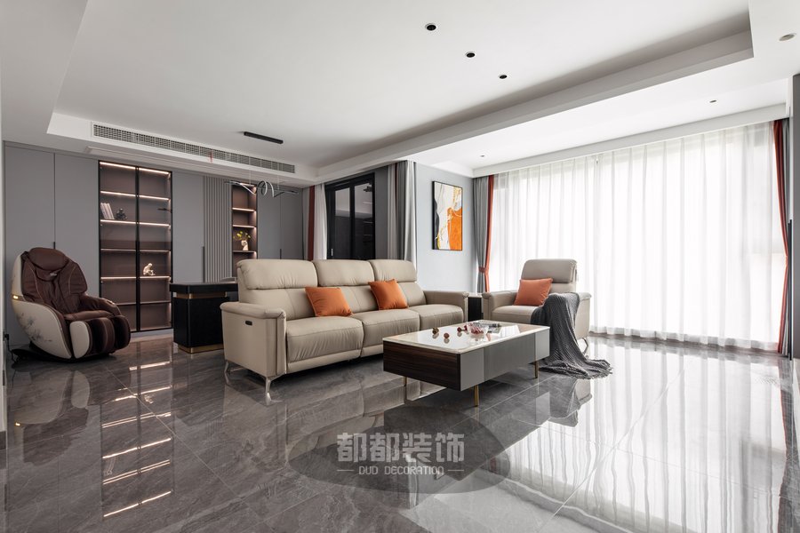 客厅为全开放式布局,整墙的落地窗设计让阳光肆无忌惮的挥洒在每个空间,活泼橙元素仿佛一个个小太阳将单调的客厅照亮。 杨姐家的电视背景墙简约而不简单,咋一看只是岩板+格栅的老熟人组合,但这两个材料的拼接、用量很巧妙,L型木格栅打破了整面墙的对称感,暖黄色灯带更是给空间带来了别样的静态美。 豆腐块沙发简直是客厅的颜值天花板,橙色小抱枕瞬间让空间活跃起来,抽象唯美的艺术装饰画点缀于墙面,高级感满满! 利用沙发做为隔断,以沙发背后设计一个开放式的书房区域是杨姐最喜欢的地方,沙发背后放置书桌,让空间的分区更明显,平时工作学习时让人感觉安稳踏实,靠墙储物柜不仅仅可以放书,放绿植和小摆件也是一把好手。