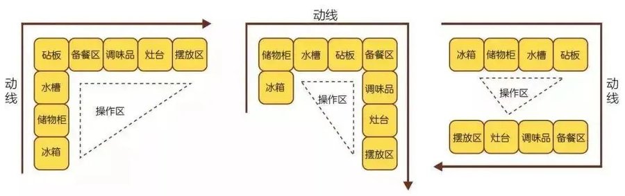 我们做饭一般都是按照拿-洗-切-煮-盛这个顺序进行的,对应的厨房操作位置应该是冰箱\储物柜-水槽-加工台-备餐台-调味品区-灶台-装盘台,形成一个动线清晰,省时高效的厨房空间。