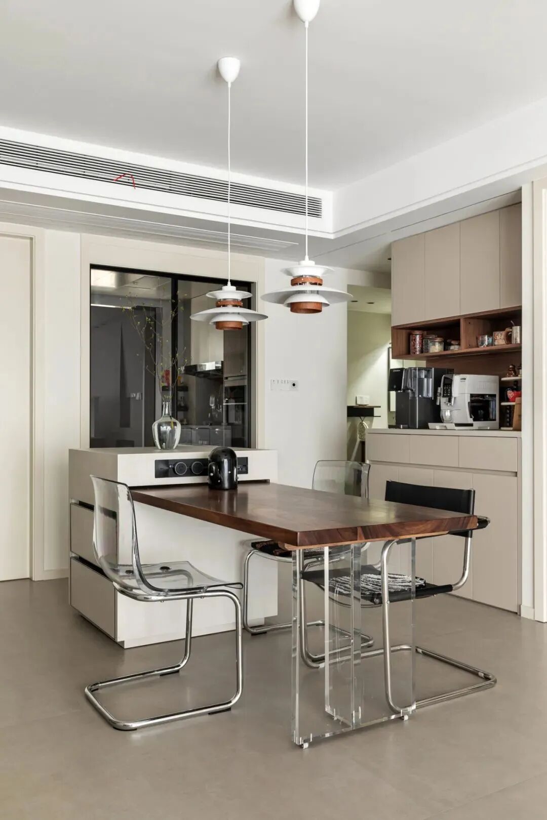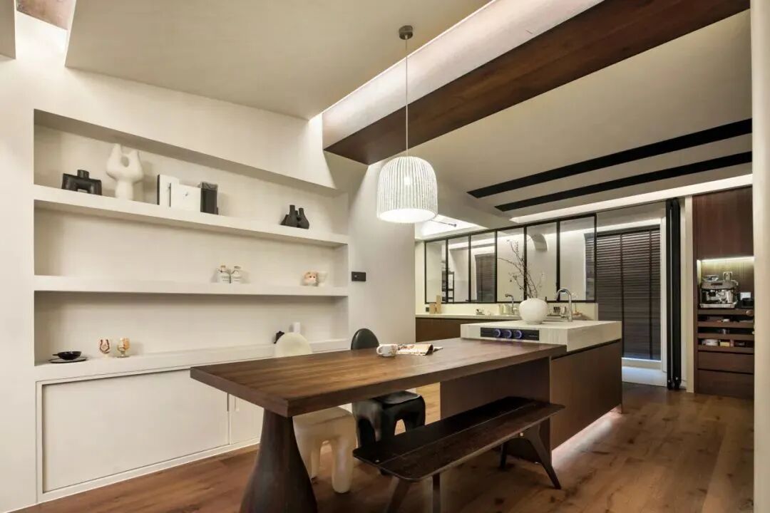 这种创新的设计将餐桌和厨房的岛台结合起来,不仅颜值很高,也带来了相当独特的空间体验。